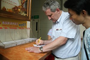 Firmando una de las paginas de la Cerveceria Tsingtao en Qingdao, China en presencia de uno de los periodistas del Servicio Aleman de Radio Internacional de China.