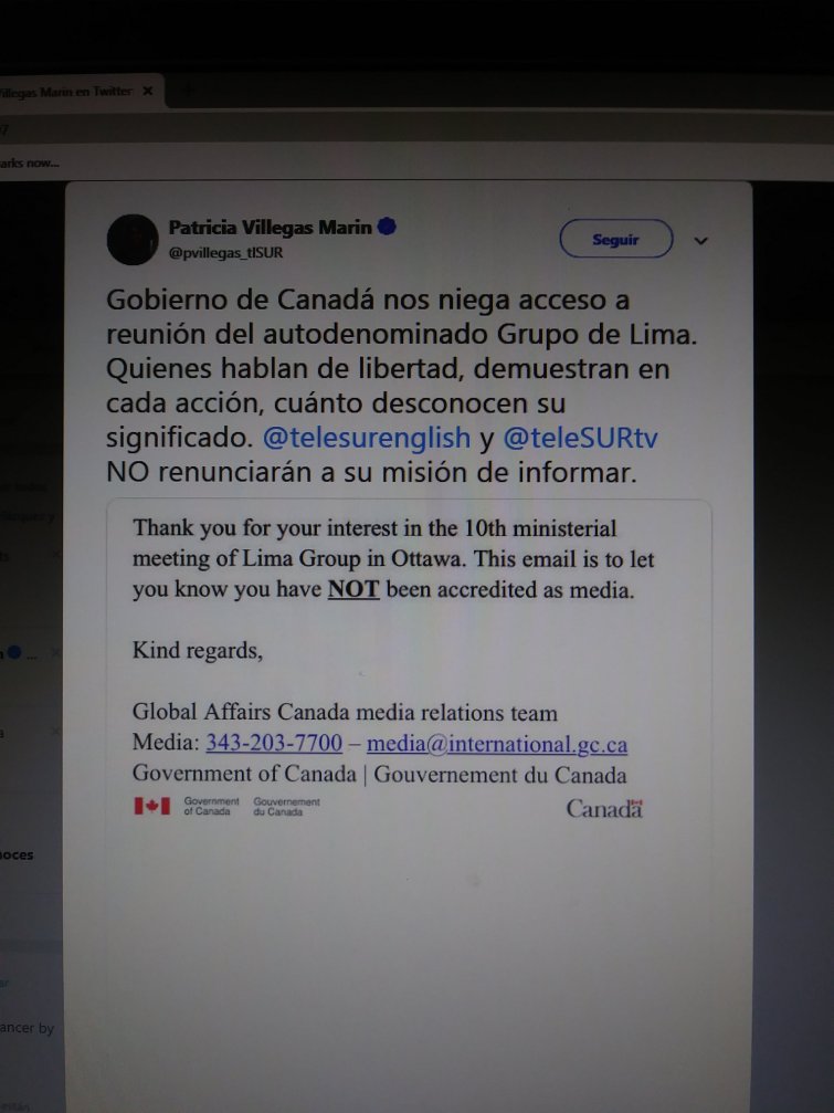 Canadá Niega Credenciales A Telesur Para Grupo De Lima (Twitter de Patricia Villegas Marín Presidenta de Telesur)