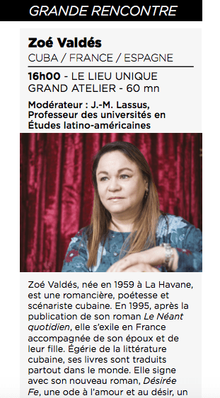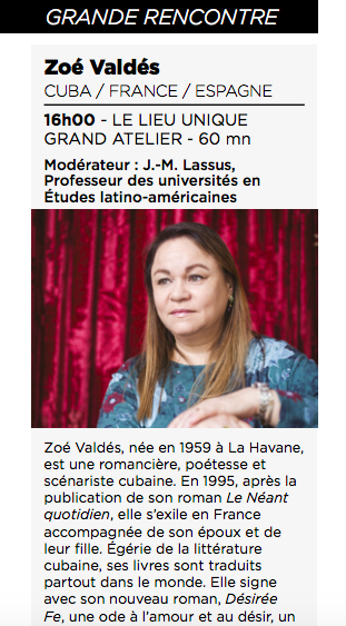 Escrito por alvarezgallosofebrero 5, 2019 Próximamente en el Festival Atlantide de Nantes Zoé Valdés Programación en el Festival Atlantide de Nantes, ver página 21. Con lo mejor de lo mejor. SUFRE. Ver la entrada originalComparte esto: Compartir en Facebook (Se abre en una ventana nueva) Facebook Compartir en X (Se abre en una ventana nueva) X Imprimir (Se abre en una ventana nueva) Imprimir Compartir en Telegram (Se abre en una ventana nueva) Telegram Share on LinkedIn (Se abre en una ventana nueva) LinkedIn Compartir en WhatsApp (Se abre en una ventana nueva) WhatsApp Me gusta Cargando... Deja un comentario Cancelar la respuesta Δ Este sitio utiliza Akismet para reducir el spam. Conoce cómo se procesan los datos de tus comentarios.