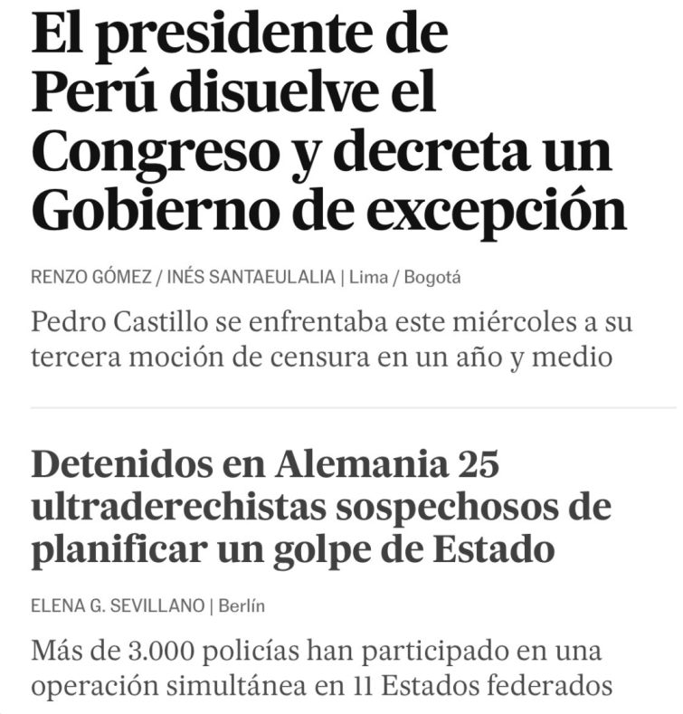PorRedacción ZoePost. El País tiene muy claro que los intentos de golpes de Estado son intentos de golpes de Estado pero no tiene tan claro que los golpes de Estado sean golpes de Estado. pic.twitter.com/lrMj3ZvHNR — Juan Ramón Rallo (@juanrallo) December 7, 2022