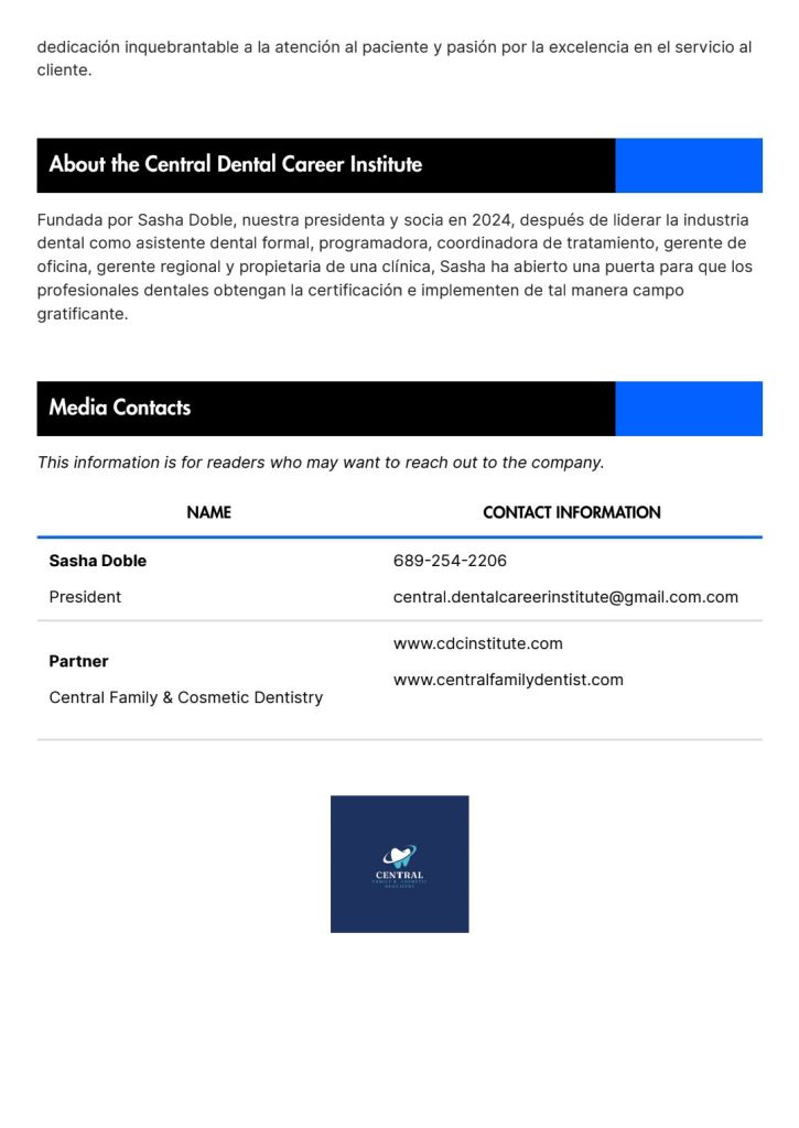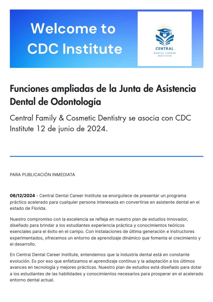 CENTRAL FAMILY AND COSMETIC DENTISTRY SE ASOCIA CON CDC INSTITUTE [FLORIDA][SASHA DOBLE]